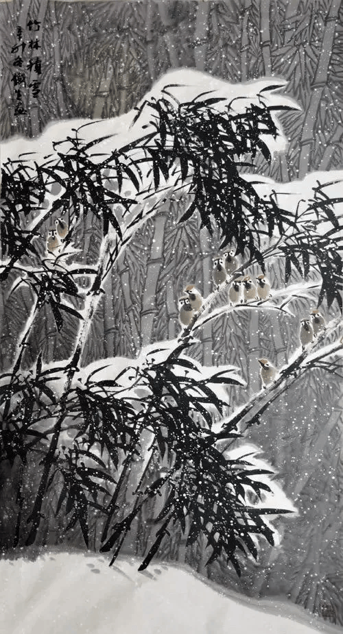 以浓墨画出前面上下两组,调色添上麻雀,增加情趣。然后调淡墨大面积平涂造景,留出白雪。趁湿以浓墨勾出背景的竹叶,使其自然渗化,减弱其形。其画面黑白灰对比强烈,有装饰性,既有新意,又有现代感。