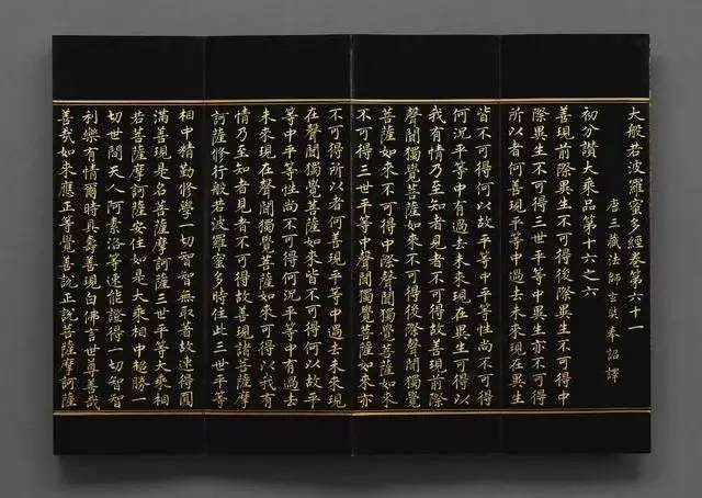 宣德年间,宣宗诏命圣僧慧进对写金字,主持抄写四大部经,其中当有御制《大般若波罗蜜多经》,现幸存十卷,羊脑笺本泥金,字体澄净秀逸如浮云,品相尤佳,除台北故宫博物院藏宣德御制《大宝积经》与《大涅盘经》外,目前没有见到过其他同类藏品。
