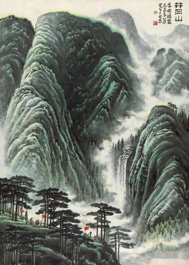 第三,构图与体量感的强化。 受西方绘画影响,李可染的构图趋于饱满与稳定。他提出“满构图”理念,山体常占满画面,形成纪念碑式的视觉力量。这种“满”与传统“留白”的“虚”形成张力,创造出“黑、满、重、亮”的独特视觉语言。在《万山红遍》《革命摇篮井冈山》等作品中,山体的体量感与崇高感被极大强化,赋予山水以时代精神与象征意义。
