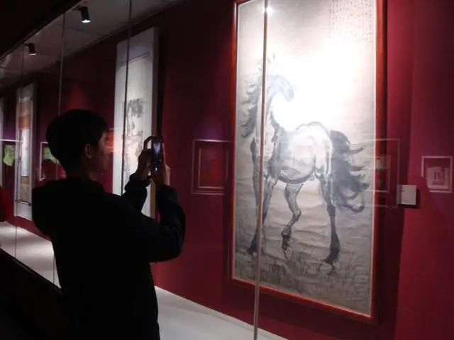 10月23日,观众在成都宝光寺拍摄徐悲鸿画作。