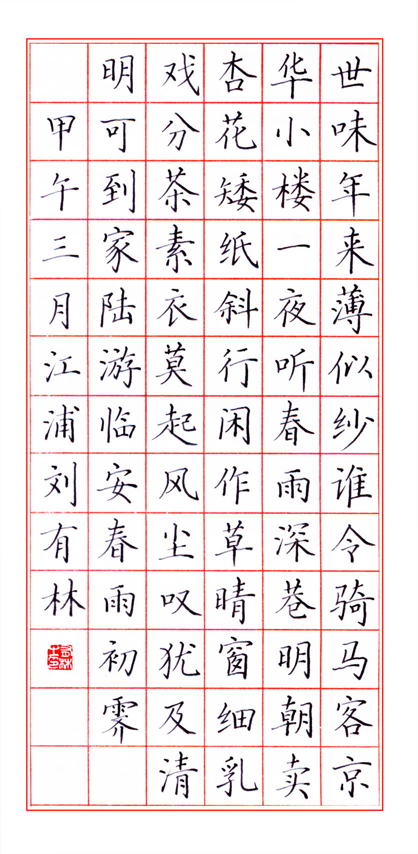 正文书写完毕后,接着就是落款和钤印了。落款书体大多为楷书和行书,款字的大小,不能要比正文字大,一般略比正文小,以突出正文,避免喧宾夺主。印章的内容要和正文的内容保持一致,也不要太大,要起到画龙点睛的作用。