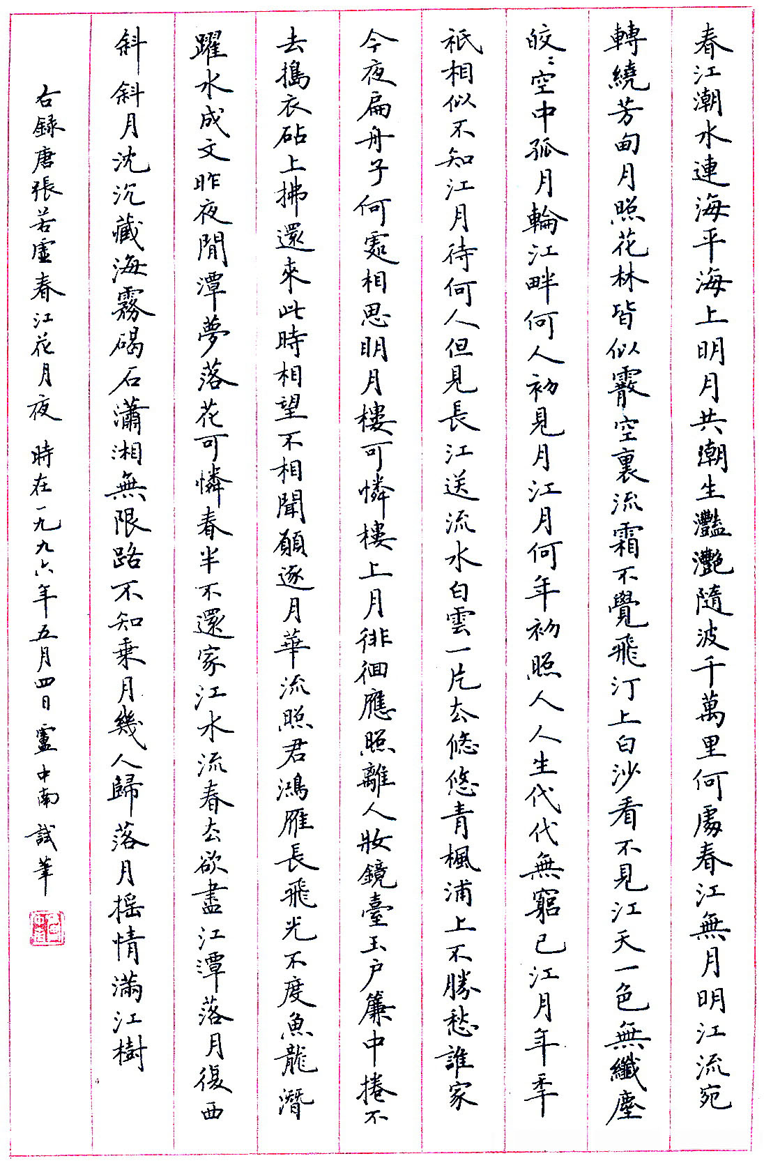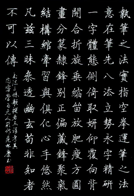 创作从第一字开始就要用心去写,所谓良好的开端等于成功的一半,第一个字的书写也基本上定下了整个创作的一个基调,是整个创作基调最重要的地方。书写时掌握书写节奏,楷书未必写的很慢,该快则快,该慢则慢,这样写出来的字才有韵味。字的大小也要用心考虑,或大或小,遇到在同一作品中出现很多一样的字,也要认真处理,避免写成一样,这样作品才更有魅力。创作的过程中,经常会遇见一些小问题,如错字、漏字等现象,要慎重处理,可以加注,最好重写。