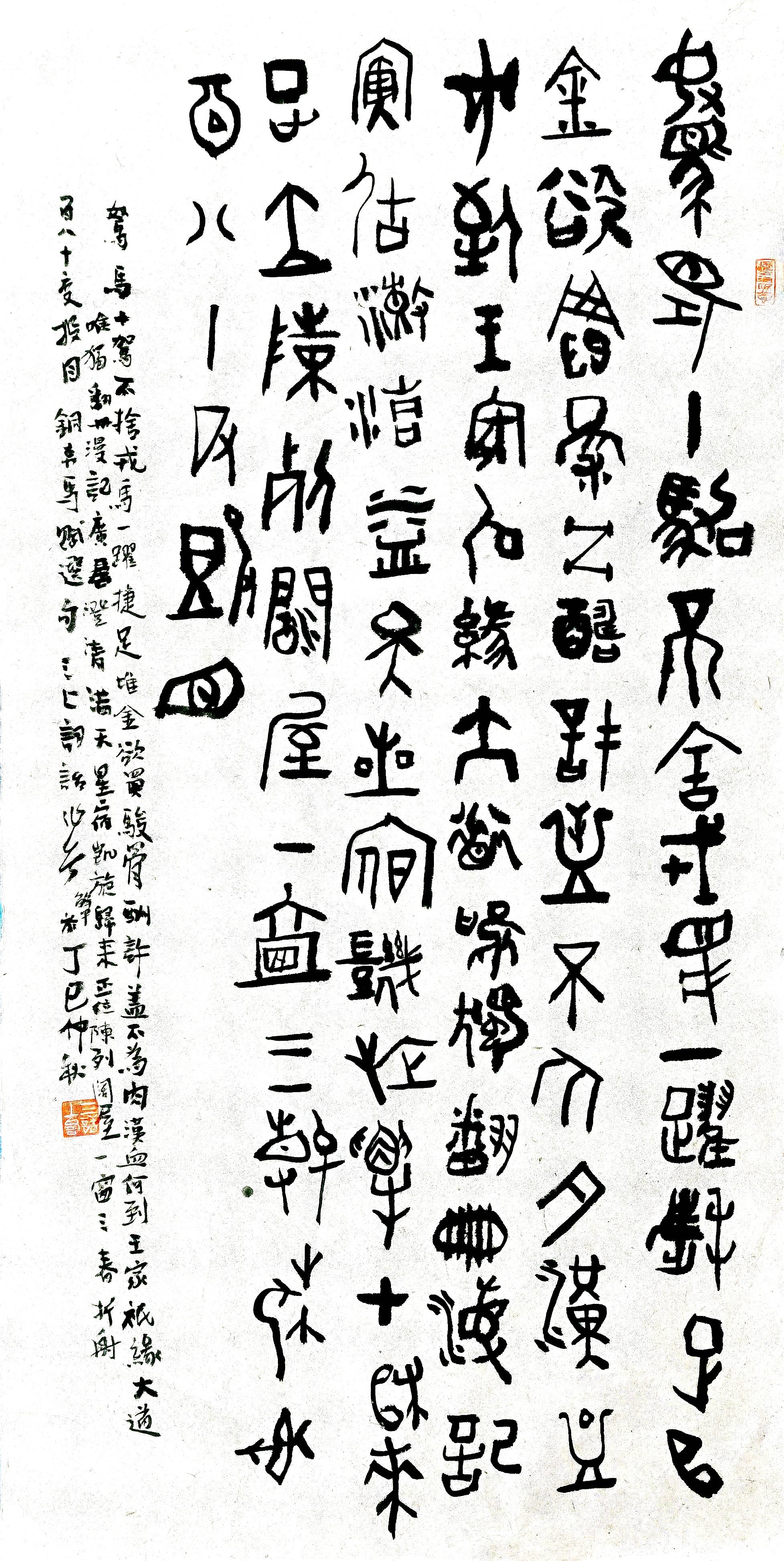 《铜奔马赋》选句:“驽马十驾不舍,戎马一跃捷足。堆金欲买骏骨,酬许盖不为肉。汉血何到王家,只缘大道唯独。翻删漫记广居,澄清满天星宿。凯旋解甲归来,正位陈列阔屋,一窗三春折射,百八十度投目”甲骨文金文书法,以骏马意象为魂,其书法表现与甲骨文、金文之美学基因一脉相承。