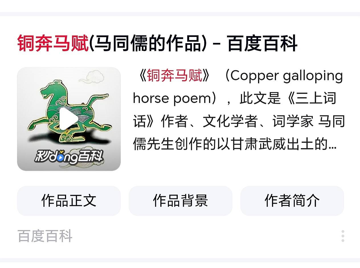 释文:驽马十驾不舍,戎马一跃捷足。堆金欲买骏骨,酬许盖不为肉。汉血何到王家,只缘大道唯独。翻删漫记广居,澄清满天星宿。凯旋解甲归来,正位陈列阔屋,一窗三春折射,百八十度投目。(马同儒:铜奔马赋,兰州日报,中国作家网、中国诗歌网、作家网)