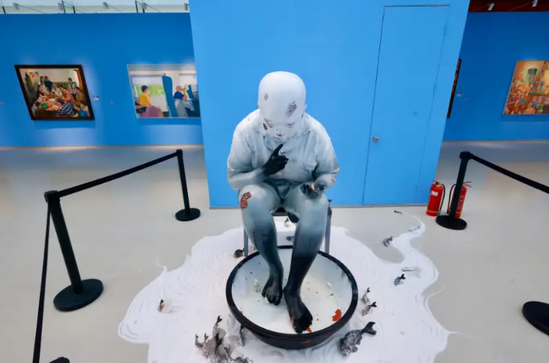 水立方则展出其余两大板块的作品。其中,“无界漩涌・多元媒介的共生激荡”板块设于水立方北区空间,集中展示绘画、综合材料、雕塑、装置艺术等多元形式的青年艺术作品。本版块以“艺术语言的拓展与本体创新”为核心策展理念,依托水立方独具未来感的建筑形态与浓厚的科技氛围,致力于打破绘画、雕塑、装置等传统艺术媒介之间的固有边界,构建出一个鼓励自由探索与跨界交融的艺术实验现场。