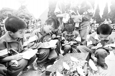 4月2日,参加祭扫烈士墓的广西靖西县新靖镇中心小学学生用笔记本记下英烈事迹。新华社发
