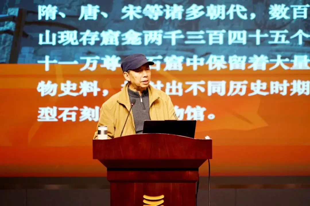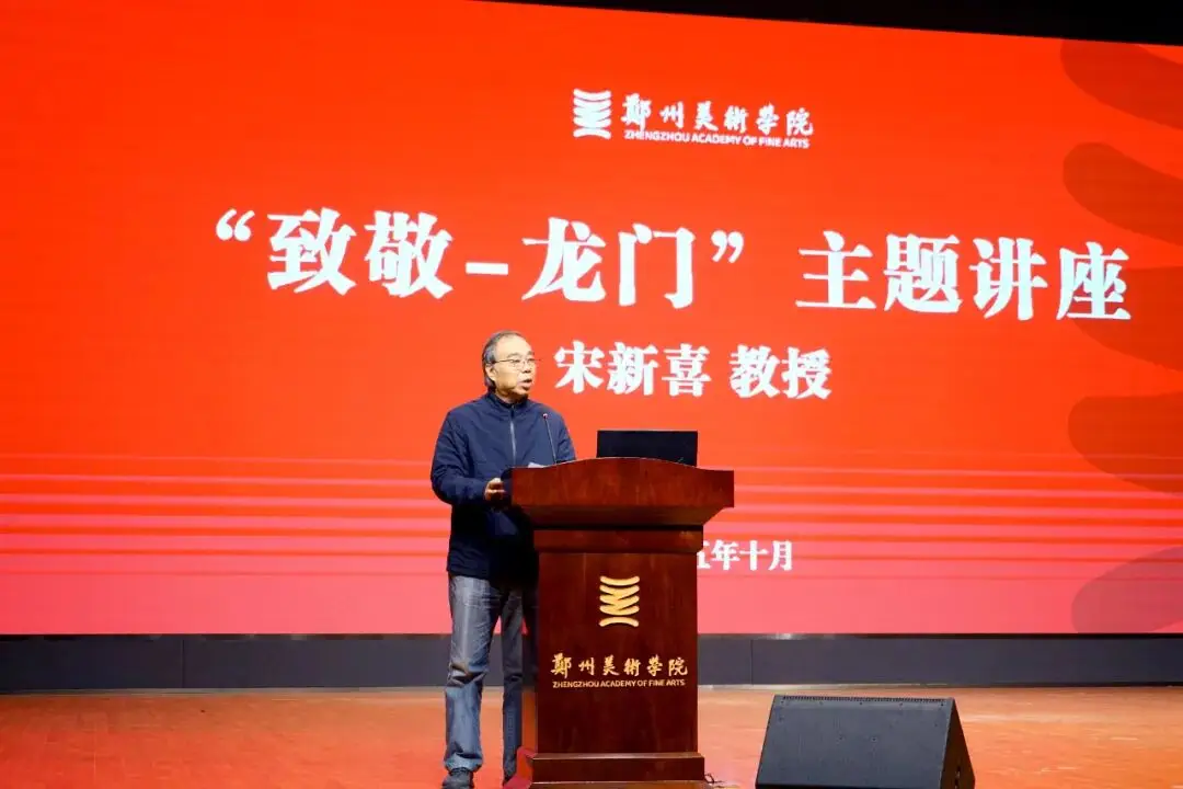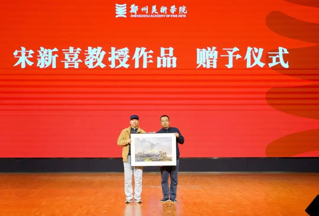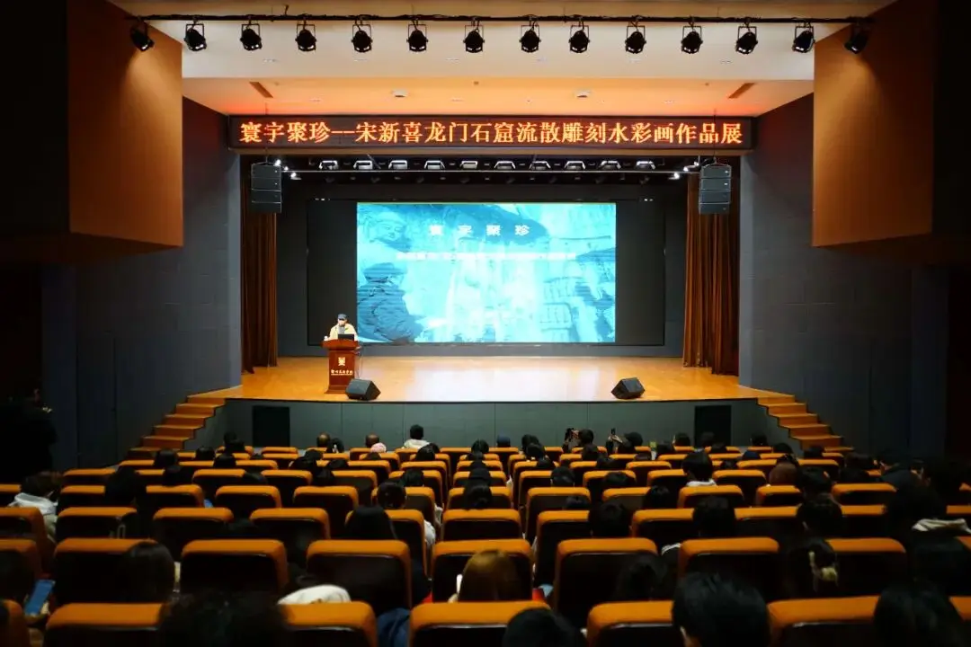 “致敬—龙门”主题讲座由杨钢主持。讲座开始前,宋新喜将其水彩作品《山西偏关印象》捐赠给郑州美术学院,随后以“龙门石窟的过去、现在与未来”为脉络,从建造历史、文物劫难、流散回归、数字化复原到造像艺术之美等维度,系统解读龙门石窟的历史价值与艺术魅力。他还结合自身创作的龙门石窟流散雕刻水彩画作品,生动再现“万佛生辉”的石窟盛景,让古代工匠的杰出创造力与遗失文物的千年沧桑跃然眼前。对此,师生们纷纷表示收获颇丰,不仅通过画笔直观感受到千年前石像的艺术张力,更深刻领悟到艺术创作者手中的画笔承载着记录历史、守护文化的重要价值。